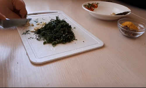 - Соняшникова олія, лавровий лист, сіль, приправи, кріп.