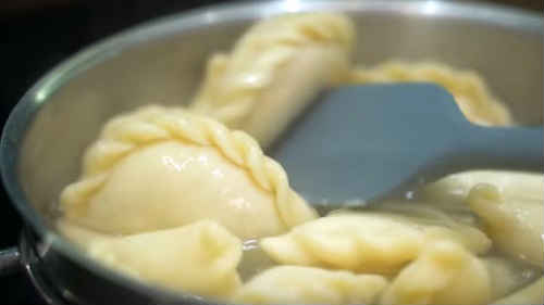 Відваріть заготовки в підсоленій воді. Після закипання обов’язково розмішайте вареники, піднявши із дна (вони можуть прилипнути). У воду раджу додати перець, лавровий лист, але це не обов’язково. Готуйте вареники після закипання 5-7 хвилин.