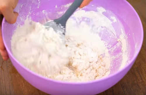 Замісіть основу тесту. Спочатку дійте ложкою, так зручніше. На даний заміс піде приблизно 3 хвилинки.