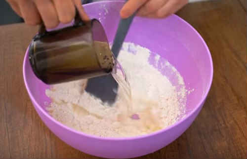 Засипте просіяне борошно в глибоку ємність, швидко залийте тонким струменем масляну воду.
