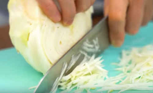 Приготування почнемо з начинки. Нашаткуйте капусту самої тоненькою соломкою, який тільки зможете.