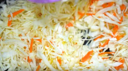 Закиньте капусту, продовжуйте смажити овочі разом. Зверніть увагу, овочі ми не гасимо, а смажимо, тому вогонь повинен бути досить інтенсивним. Готуйте начинку, поки капуста не стане м’якою.