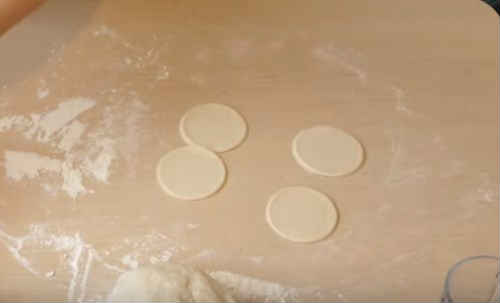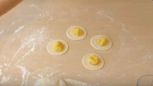 - Розкачайте тісто, наріжте кружечки. Викладіть в кожне коло начинку, закріпіть краю.