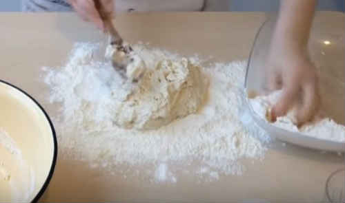 - Потихеньку додайте борошно, вимішуючи руками кожну порцію до однорідності маси.
