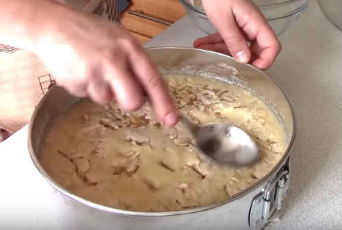 Повторіть шари: сухі інгредієнти, що залишилися яблука. Зверху розсипте залишки сухих продуктів. Знову розрівняйте.