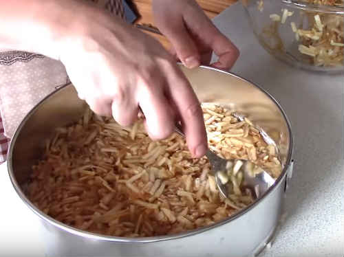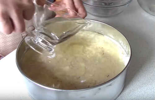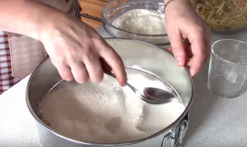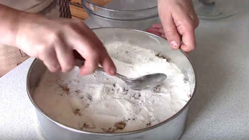 Сформувати пиріг дуже легко. Для цього знадобиться форма, выстеленная папером для випічки, бажано роз’ємна. Пекарську папір трохи змастіть пісним маслом. Насипте на дно форми склянку сухої суміші. Розрівняйте шар.