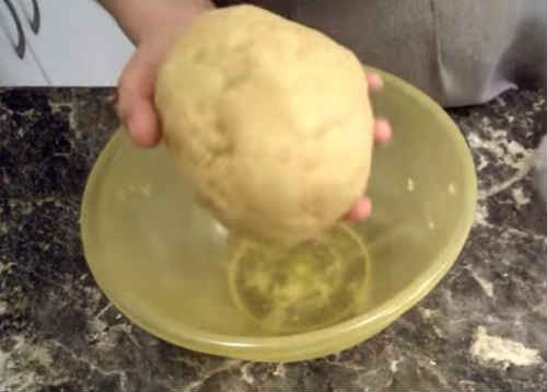 - Плесніть крижану воду, додавши в неї лимонний сік. швидко замісіть тісто, зберіть в коржик. Загорніть в плівку і відправте настоюватися в холодильник. Час заготівлі – 30 хвилин.