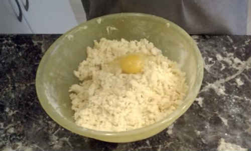 Вбийте яйце, продовжуйте перетирати вміст, поступово збираючи масу в кому.