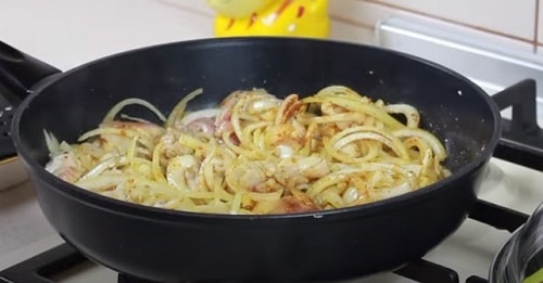 - Обсмажте в олії спочатку філе. Потім, коли воно трохи зарум’яниться, по черзі закладіть цибулю і моркву.