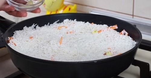 - Посоліть, приправте спеціями, перерахованими у складі рецепта. Вставте в рис часникові часточки.