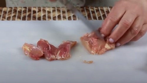 - Видаліть з грудки шкірку, м’ясо наріжте брусочками середнього розміру.