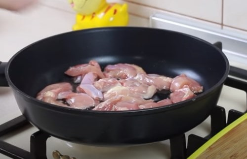 - Налийте на сковорідку олію, викладіть порізане кубиками філе. Обсмажте до рум’яного кольору кольору. Курка буде ще соковитіше смачніше, якщо попередньо обваляти шматочки в борошні.