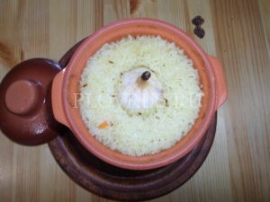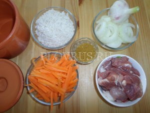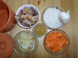 8. Увімкніть духовку на 180-200 °C і підготуйте горщики. Залишається тільки покласти всі продукти в посуд і відправити на запікання в духову шафу. Плов в духовці зі свининою, рецепт якого ми будемо використовувати, можна приготувати двома способами: з попередніми обсмажуванням продуктів або без нього.