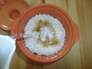 9. Якщо ви хочете приготувати смачне, але не дуже калорійне блюдо, то вам просто необхідно скласти всі продукти в горщик шарами і залити водою. Змастіть дно посуду невеликим шаром рослинного масла, щоб овочі і м’ясо не прилипли. Почніть заповнювати горщики продуктами в такому порядку: цибулю, моркву, м’ясо, рис. Не заповнюйте горщик до країв — останній шар повинен бути нижче плеч на 3-4 сантиметри.