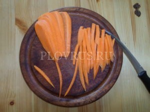 3. Моркву нашаткуйте тонкою соломкою або кружечками. Якщо хочете, щоб страва виглядало ефектніше, можна використовувати фігурну нарізку.