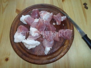 2. Свинину бажано брати з невеликою кількістю жирку, з шиї або лопаткової частини. Можна використовувати вже готовий гуляш або будь-шматок без кісток. Наріжте м’ясо невеликими шматочками, приблизно 3 х 4 сантиметри.
