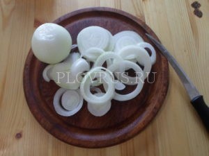 4. Цибулю нарізати кільцями не дуже тонко, щоб не було зайвого соку. Кількість овоча повинно бути приблизно таким же, як і м’яса.