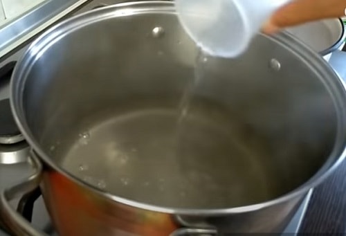 Перелийте настій в каструлю, заміряйте його обсяг, від цього залежить, скільки спецій нам знадобиться. Засипте сіль з цукром. Доведіть до закипання. Розмішуйте розсіл, поки кристали спецій не розчиняться повністю.