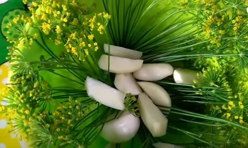 Обполосніть кропові парасольки. Часточки часнику розрізати на частини.