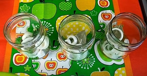 - Наріжте цибулю кільцями, помідори часточками, зручними для закладання в банки. У перців видаліть насіння з перегородками, настругати пелюстками. Часникові головки розберіть на зубчики, великі розріжте навпіл.