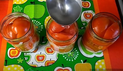 Закип'ятіть воду, залийте в банки, налив по вінця. Прикрийте ємності кришками. Залиште банки на чверть години, щоб овочі встигли добре прогрітися.