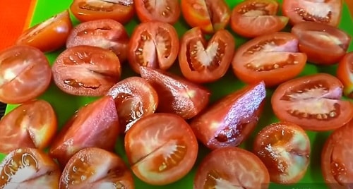 - Наріжте помідори частинами. Зручними для закладання в банки. Дрібні екземпляри можна класти цілими.