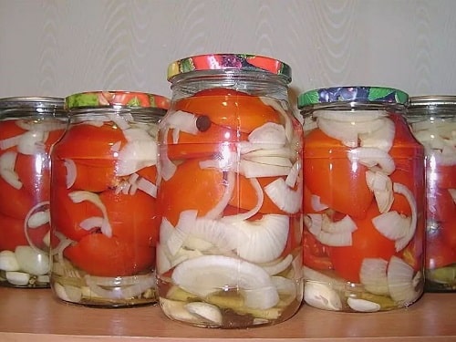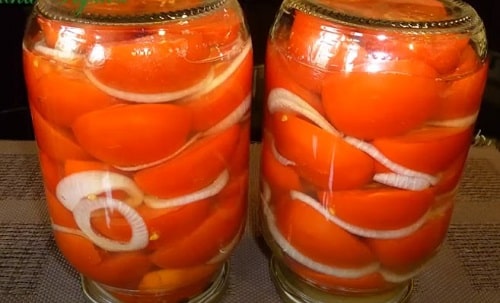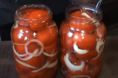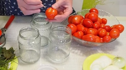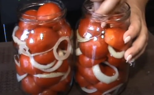 Набийте скляні ємності половинками помідорів, перемежовуючи їх цибульними кільцями. Половинки укладайте зрізом вниз.