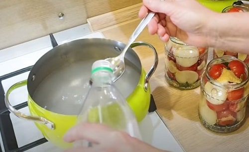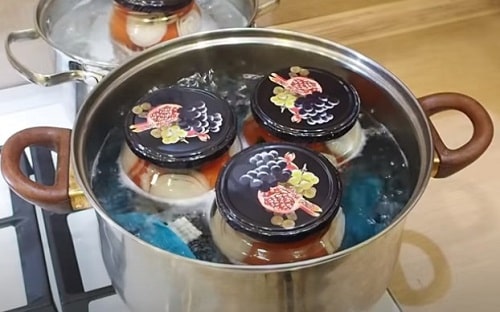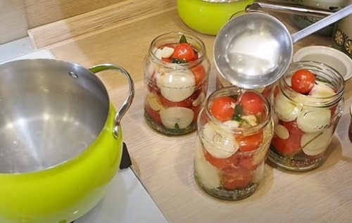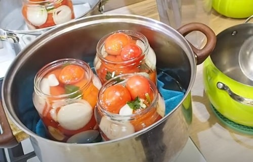- Залийте помідори, накрийте кришечками. Надішліть банки на стерилізацію. Для 3 літрового балона знадобиться 30 хвилин, літрові банки обробляйте 20 хвилин.
