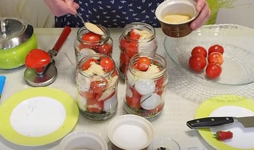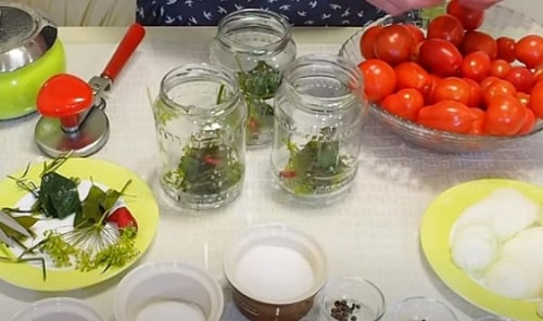 - Укладіть в банку листя зелені, засипте коріандр з насінням гірчиці. Складіть різані помідори, чергуючи половинки часником, перцем і півкільця цибулі.