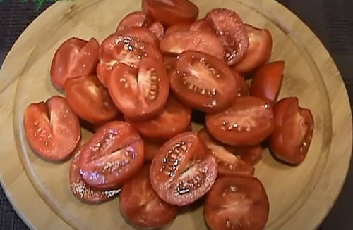 Розріжте помиті помідори навпіл. Видаліть місце кріплення плодоніжки.