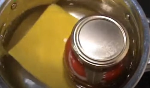 Наповніть каструлю гарячою водою на 2/3 (можна з-під крана). Підстеліть на дно тканина, встановіть банки. Завдяки підстилці скляні балони не будуть підстрибувати, зрушуватися і битися.