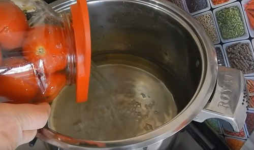 Поверніть настій з банок в каструлю, засипте всі спеції, зазначені в рецепті для маринаду. Після закипання маринаду прослідкуйте, щоб кристали солі і солодощі повністю розійшлися.