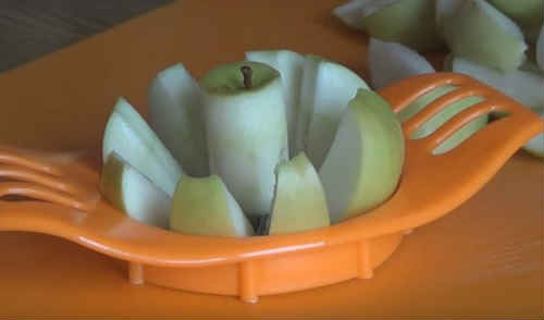 Шкірку не зчищайте, просто поділіть яблука часточками. Якщо немає спеціальної нарізки, попрацюйте ножем.