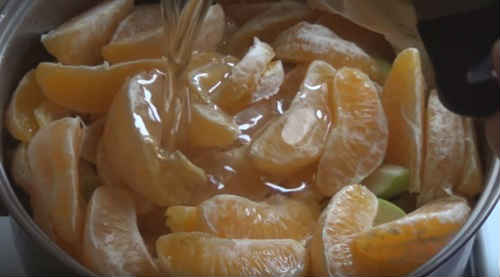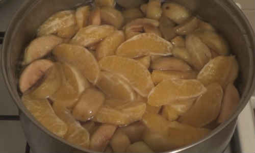 Знову поставте ласощі на конфорку, доведіть до закипання, варіть при тихому «булькання» 30 хвилин. В процесі пару раз акуратно перемішайте вміст. Стежте, щоб часточки фруктів постійно були покриті сиропом. Готовий десерт розкладіть, загорніть і сховайте в неопалюване приміщення.
