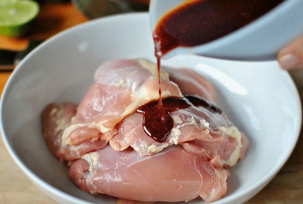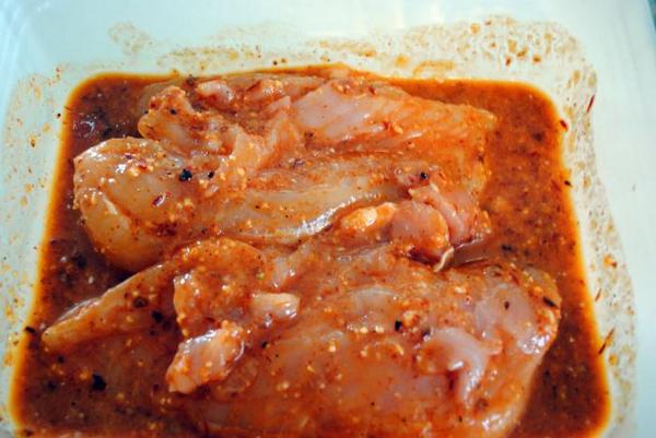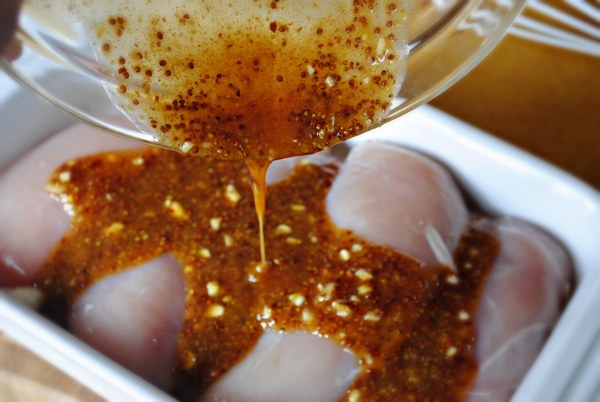 Потрібно просто перемішати всі компоненти, обмазати соусом курку і залишити в холодильнику на кілька годин.