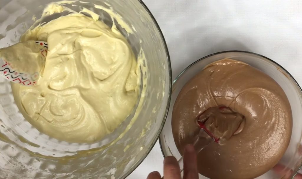 - Розділити готове тісто навпіл і перемішати одну частину з какао.