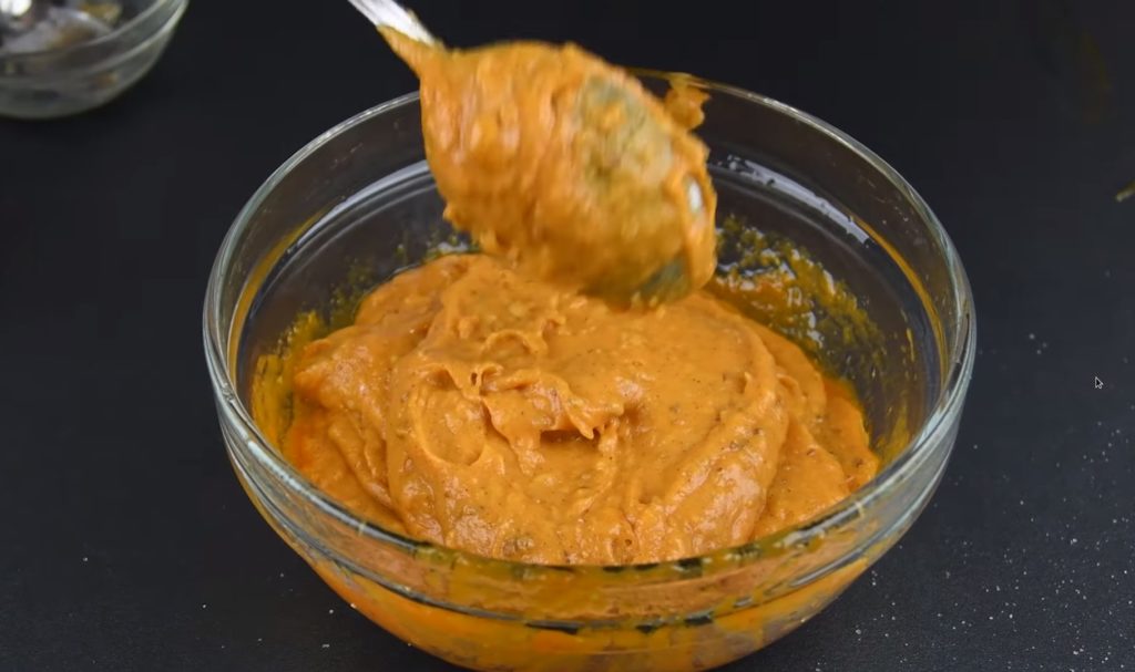 - Для приготування гарбузового тесту засипати шматочки овоча в каструлю і залити водою так, щоб ледь покривала їх. Довести до кипіння, зменшити вогонь і проварити до м’якості гарбуза. Злити воду і подрібнити овоч в пюре через сито або в блендері.