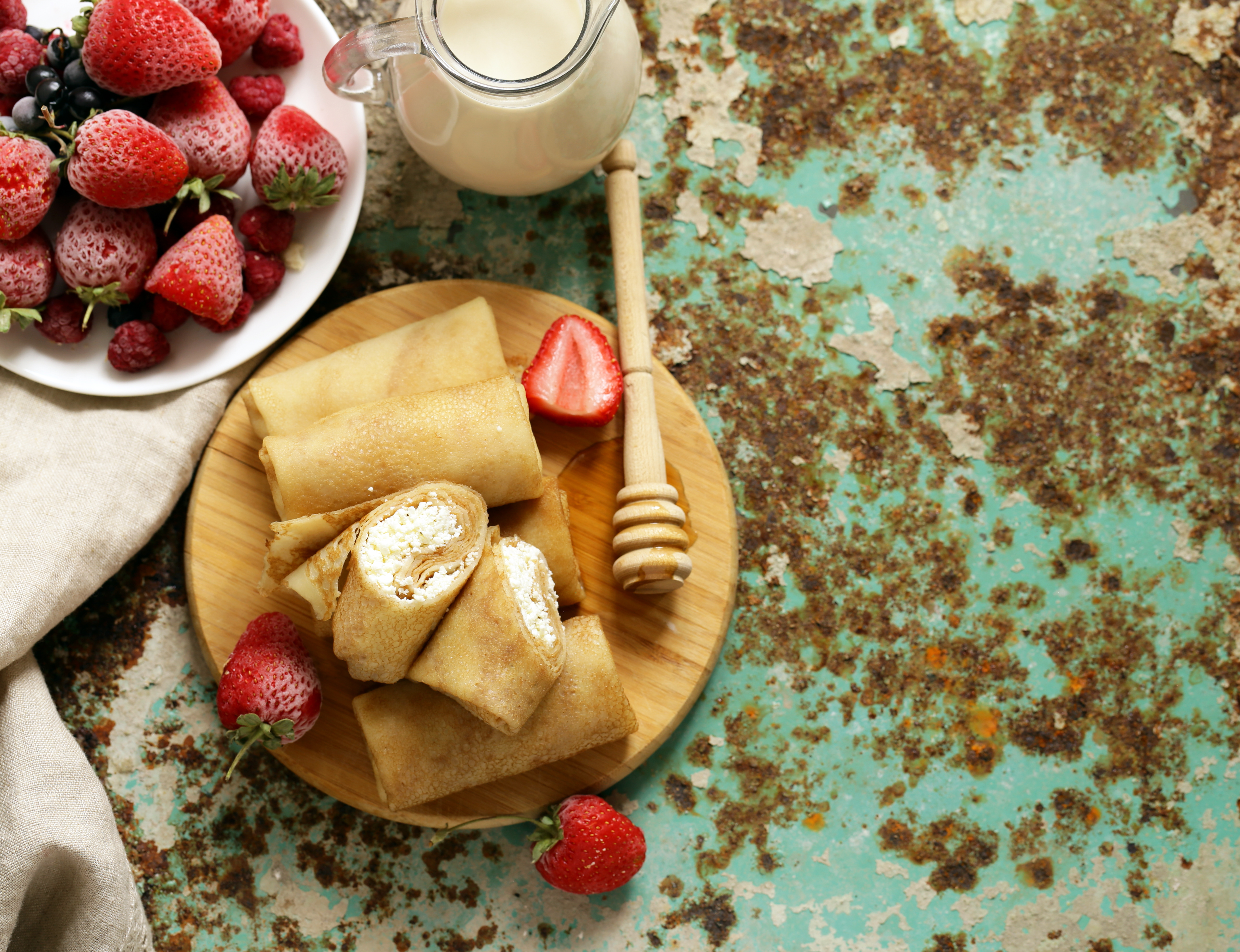 Млинці з різними начинками, але ваші основні інгредієнти в солодких млинці – фрукти, ягоди, натуральний сир, йогурт, сир. Не використовуйте занадто рідку начинку, вона буде випливати з млинця. Якщо потрібно зробити наповнювач гущі, можна використовувати жирну сметану, борошно (якщо її додати в начинку і потримати на маленькому вогні). У фруктову начинку сміливо додайте вершкове масло – воно зробить смак млинців м’якше і ніжніше. У сир для пишності можна додати ячний жовток.