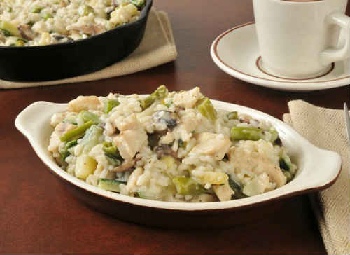 Різотто з куркою – блюдо, приготоване за особливою технологією, не втраченою з тих пір, коли в 16 столітті було випадково придумано італійським кухарем і отримало популярність. Незабаром з’явилося безліч різноманітних варіацій, заснованих на традиційних продуктах харчування жителів Середземномор’я. Свинину і яловичину жителі країни їли нечасто, а от курку на столі італійців була завжди. А ще гриби, морепродукти, значна кількість овочів.