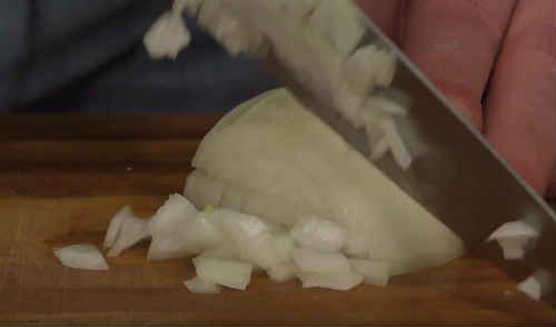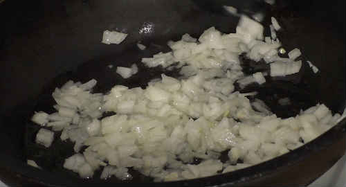 Налийте на сковорідку оливкову олію. Прогрійте його гарненько. Викладіть цибульну нарізку, припустіть протягом декількох хвилин. Сильно смажити не потрібно, цибуля стане трохи прозорим.