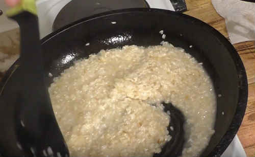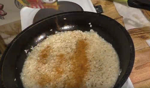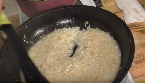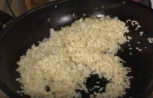 Засипте рис. Тут важливо дотримати дуже важлива умова – не поспішати. Рис повинен просочитися і розкрити свій справжній смак. Не відходьте від плити, безперервно помішуйте вміст сковороди. Коли відчує горіховий аромат, пора переходити до наступного кроку.