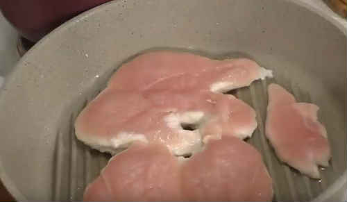 З філе грудки зніміть шкірку, обріжте зайве, викладіть на сковороду, попередньо розігріте масло.