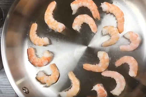 Очищені креветки викладіть на сковорідку. Швидко, буквально за пару-трійку хвилин, обсмажте. Сюди можна додати роздавлений пресом часник – буде смачніше.