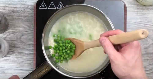 Спробуйте рис, коли піде приблизно половина бульйону. Він буде злегка недовареним. На даному етапі посоліть блюдо, здобріть перчиком. Засипте горошок. У класичному виконанні горошку немає, ви можете вилучити його, але з ним страва вийде дуже смачним.