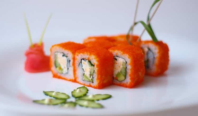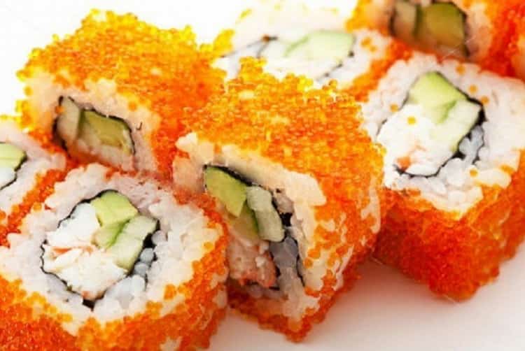 Суші «Каліфорнія» – ще один традиційний рол. До складу цього продукту входять норі, рис, огірок, авокадо і крабові палички (або м’ясо снігового краба), а зверху рол покритий смачної ікрою летючої риби, яку також називають ікра тобіко».