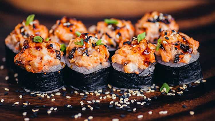 Це гарячий вид суші, з хрусткою панірувальної скоринкою і ніжною вершковою начинкою. Його калорійність на 100 грам становитиме приблизно 220 калорій. Як і вищеописаний варіант, цей не варто вживати більше декількох штучок у день, у першій половині дня.