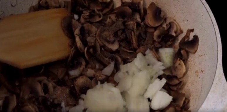 3. Гриби викладаються в суху сковороду без масла і обсмажуються на максимальному вогні близько 5 хвилин. Потім вогонь згасає, в них засипається друга головка цибулі, дрібно нарізана, сіль і трохи перцю. Начинка повинна смажитися ще 2-3 хвилини.