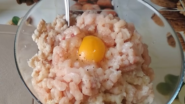 2. У розмелений фарш слід розбити куряче яйце, посолити і поперчити. Після чого масу слід ретельно вимішати. Щоб маса була еластичною, її слід добре відбити. Робити це слід мокрими руками, тоді фарш буде добре відходити від рук.