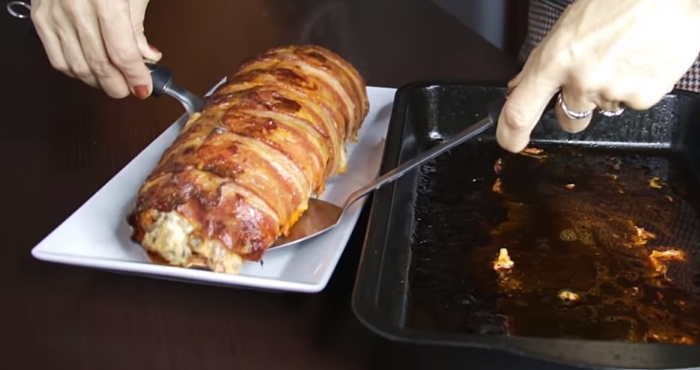 7. Робоча поверхня застеляється плівкою, на яку викладаються смужки бекону в 2 ряди по 8 штук у кожному так, щоб кожен наступний шматочок заходив на попередній. Потім посередині викладається рулет швом догори, плівка акуратно знімається, а виріб загортається в бекон.