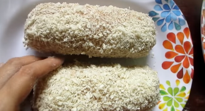5. Охолоджену курку звільніть від плівки. Кожну заготовку обваляйте в борошні, вмочіть у яйці і обсипте хлібними крихтами.